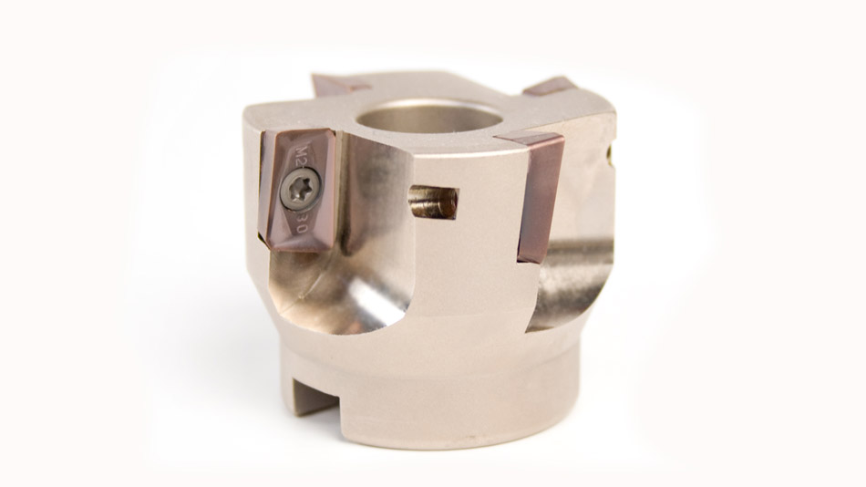 Glacern FM90 nickel-plated facemills are an excellent choice for facing surfaces with shoulders. Positive inserts provide low vibration cutting and